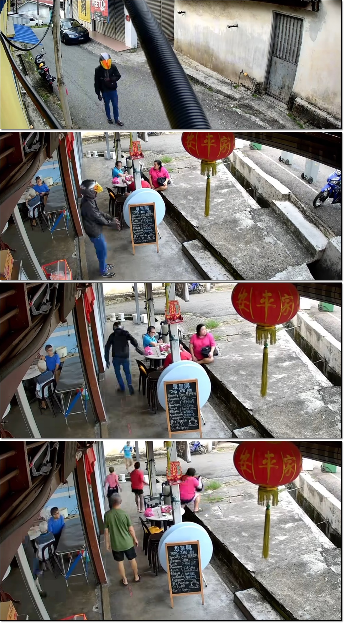 视频画路耳可见,戴着有罩头盔的劫匪,先把摩哆停在巷子,再假意光顾咖啡店。