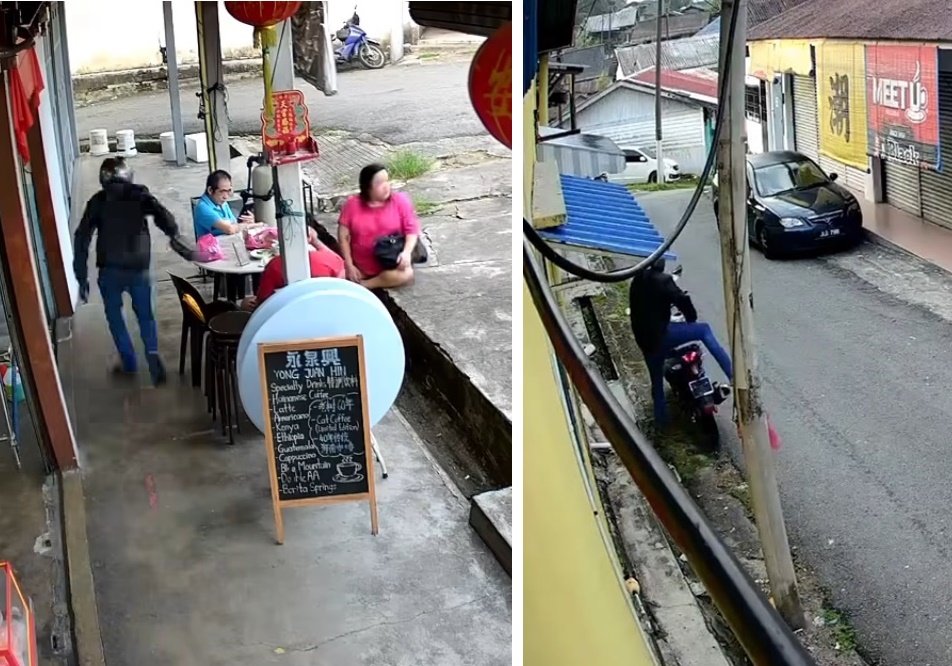 (古来17日讯)喝早茶成劫匪目标!独行匪佯装到咖啡店打包,趁着食客不留意,掠夺置放椅子的手提包,便骑摩哆逃之夭夭。