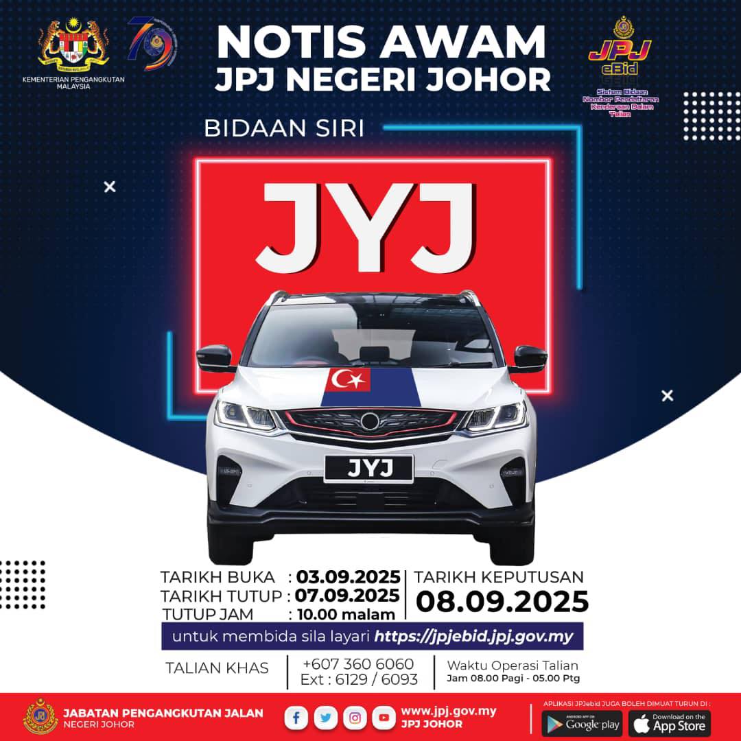 陆路交通局于宣布,柔佛车牌“JYJ”开放竞标,有意者可在9月3日起,上网竞票心目中的车牌号码。