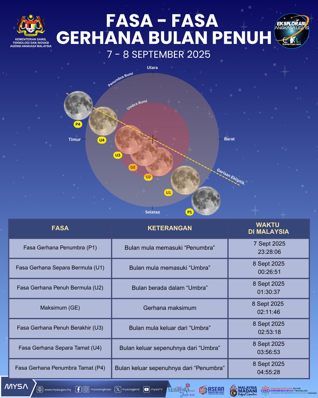 9月7日至8日,大马11:28pm─4:55am月全食现象,阶段如下: