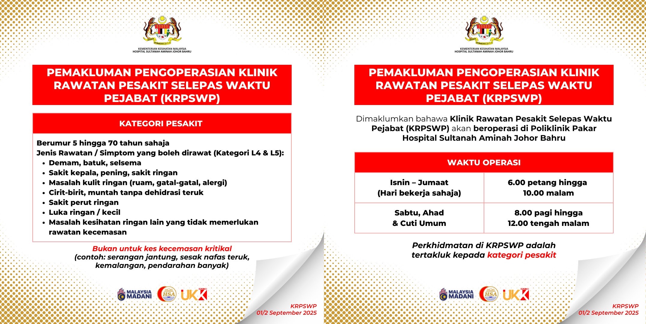 “非办公时段诊所”不适用于心脏病发作、严重呼吸急促、意外或大量出血等紧急状况,并建议直接前往新山中央医院的急诊部(Kecemasan)。