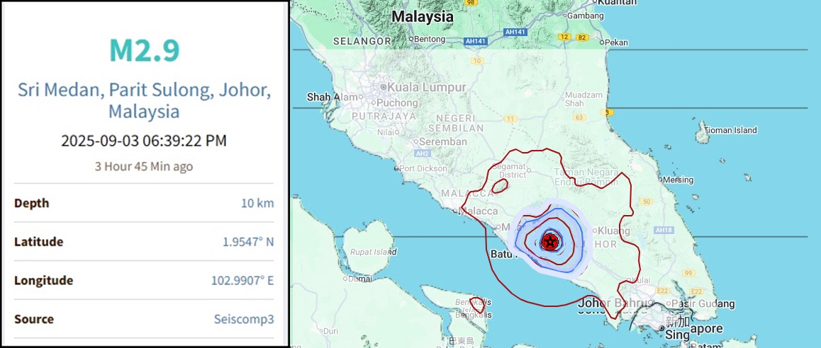 大马气象局myGempa报告,今日傍晚6时39分,在巴力士隆的铁山(Sri Medan, Parit Sulong)出现2.9级地震。