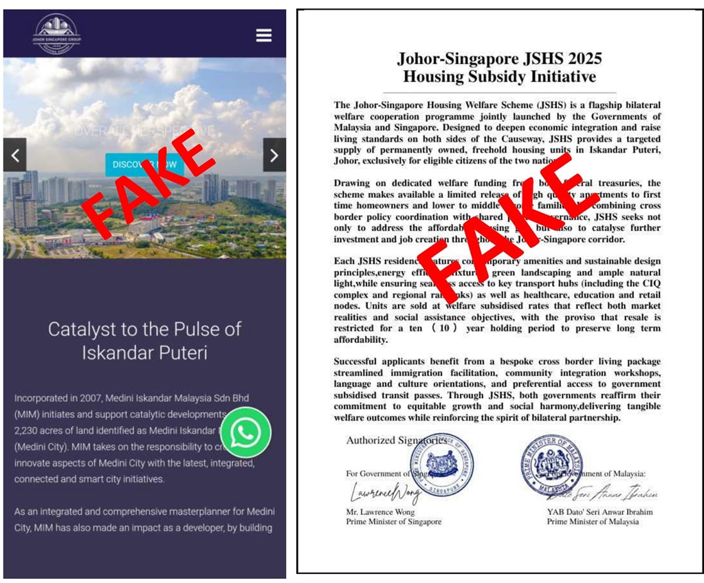 (新加坡4日讯)以“柔佛新山房屋津贴”为幌子,伺机诈骗的活动,也引起新加坡警方的关注,甚至还出现伪造新加坡总理和马来西亚首相签名的文件,诱骗购屋者。