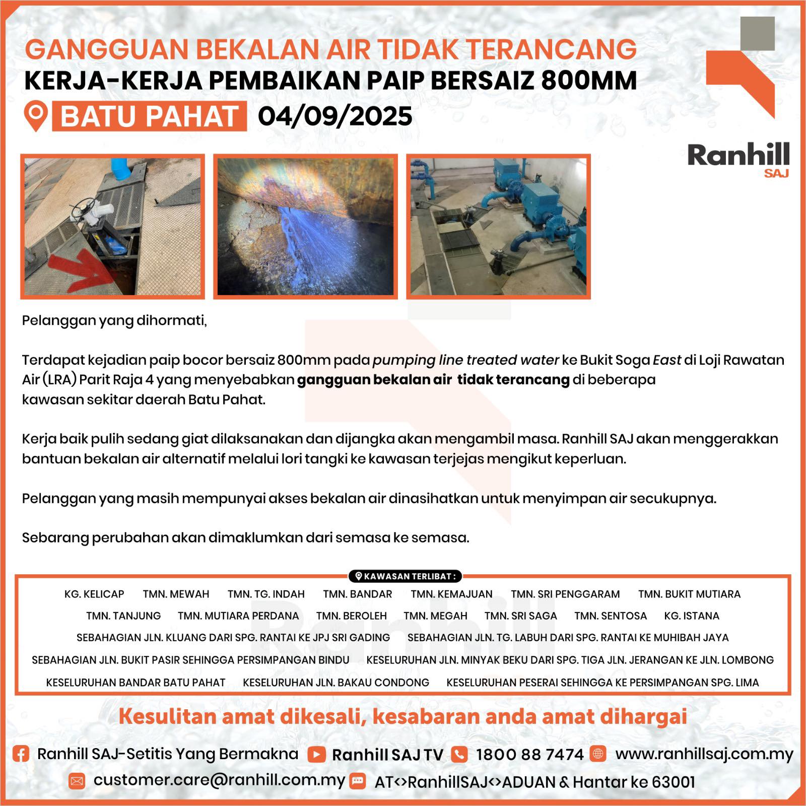 昨日通往 Bukit Soga East的 800毫米输水管破裂,以致巴力拉惹第4滤水站( LRA Parit Raja 4)被迫停止运作,造成制水。