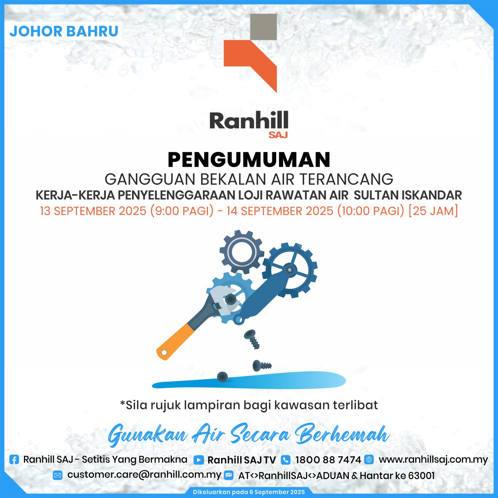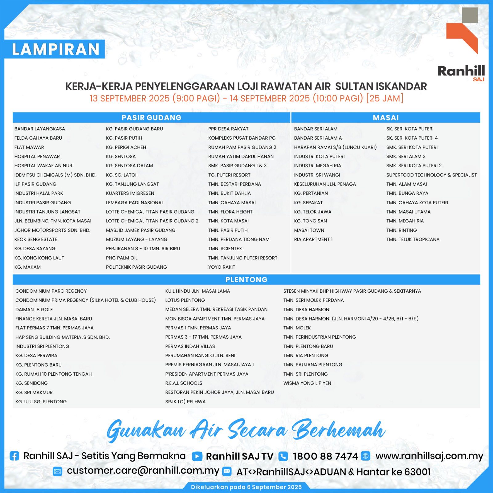 苏丹依斯干达滤水站(Loji Rawatan Air Sultan Iskandar)例常维修, 9月13日至9月14日,历时25小时,巴西古当、马西、避兰东一带水供受影响。