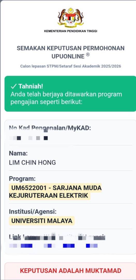 魏家祥今日发文透露,得知林敬鸿已成功被马来亚大学录取,并且进入他梦寐以求的电机工程系。