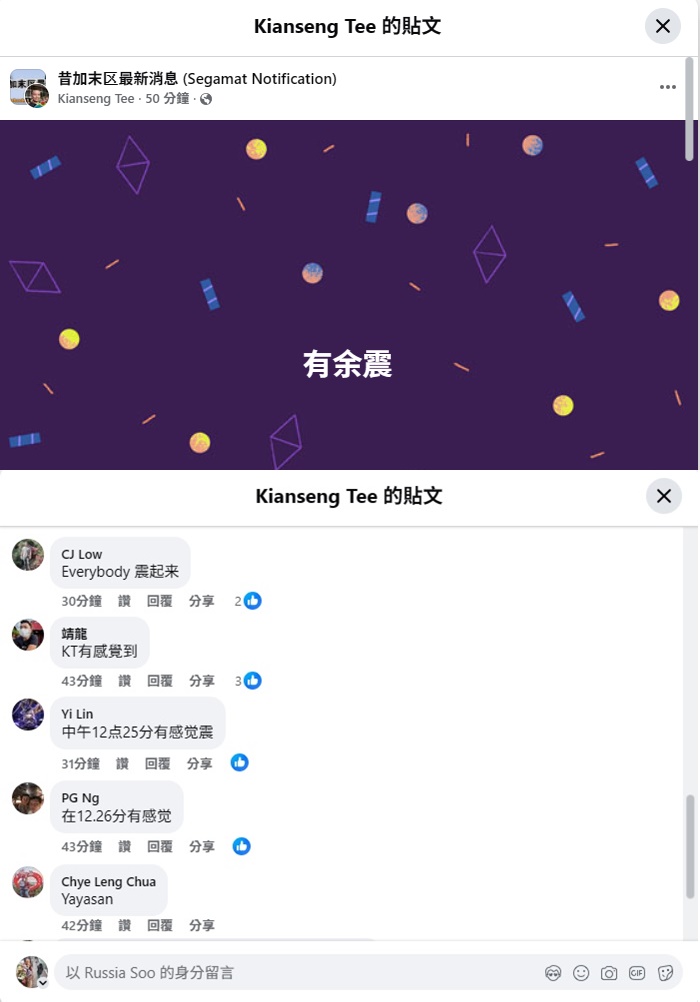另外,巫罗加什(Buloh Kasap)、Astakajaya、Taman Segamat Jaya、丽峰花园(Taman Yayasan)、Kg Jawa都有居民感觉“晃了一下”。