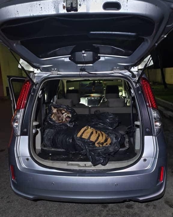 有关案件逮捕了3名男子(28岁至49岁),轿车内发现载有马来亚虎尸体,且老虎头中6枪致死。