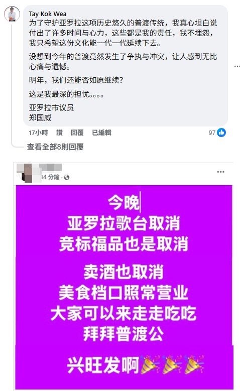 但是,负责亚罗拉区的市议员郑国威,在“昔加末圈子”一殴斗贴文中,留言提到,为了守护亚罗拉这项历史悠久的普渡传统,他付出了许多时间与心力。
