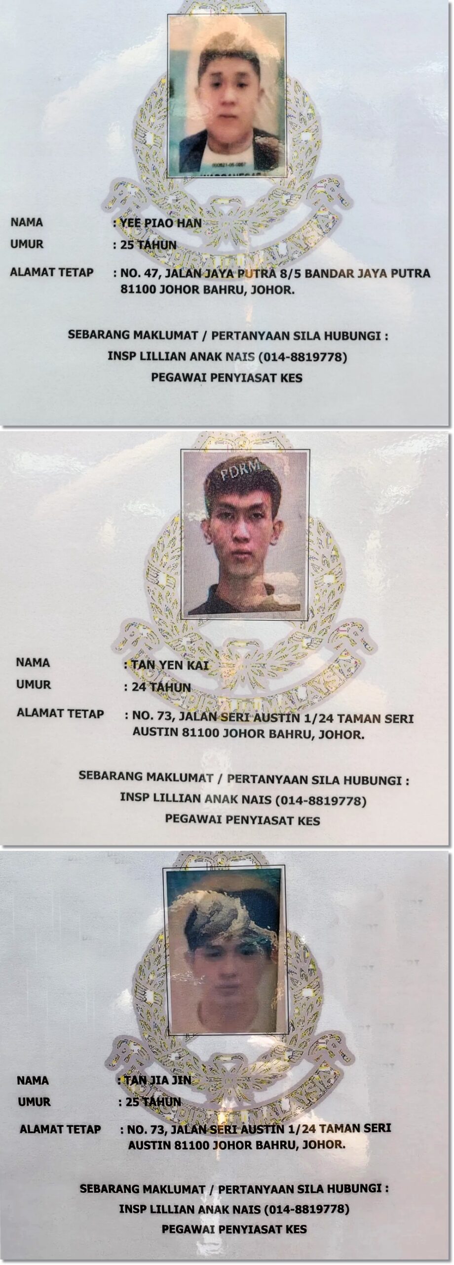 警方通缉三华裔男子