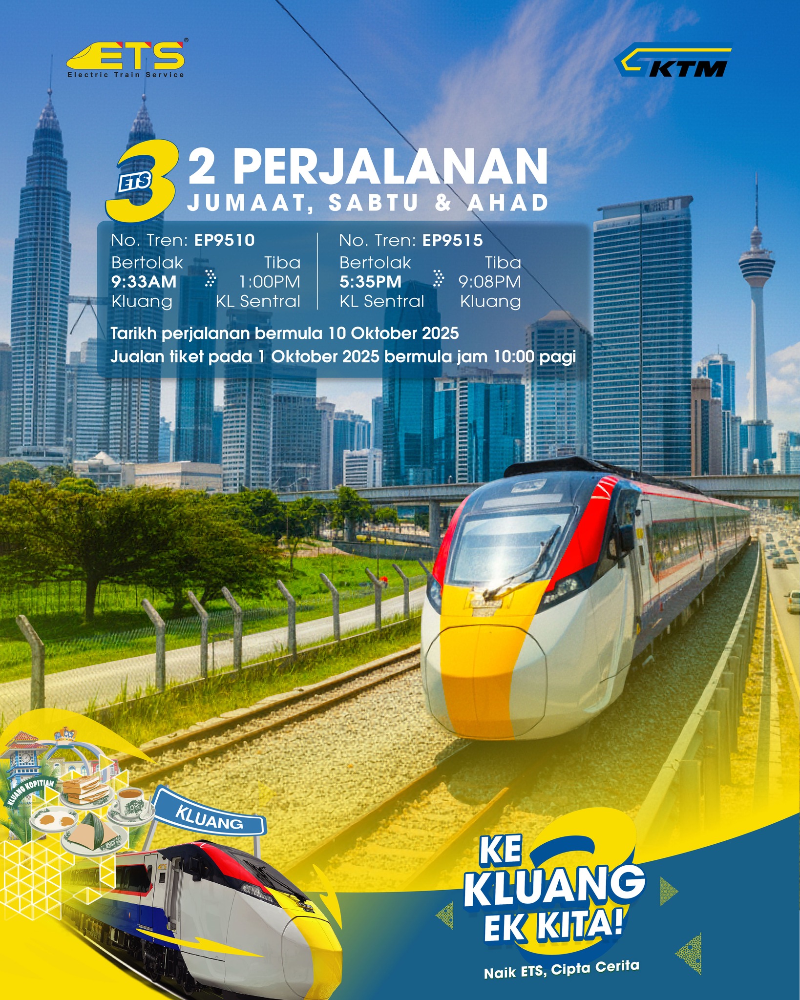 马来亚铁道公司(KTMB)宣布,10月10日起,星期五、六和日,往返居銮与吉隆坡中央车站(KL Sentral)的双轨电动火车(ETS),将开通两趟全新的周末班次。