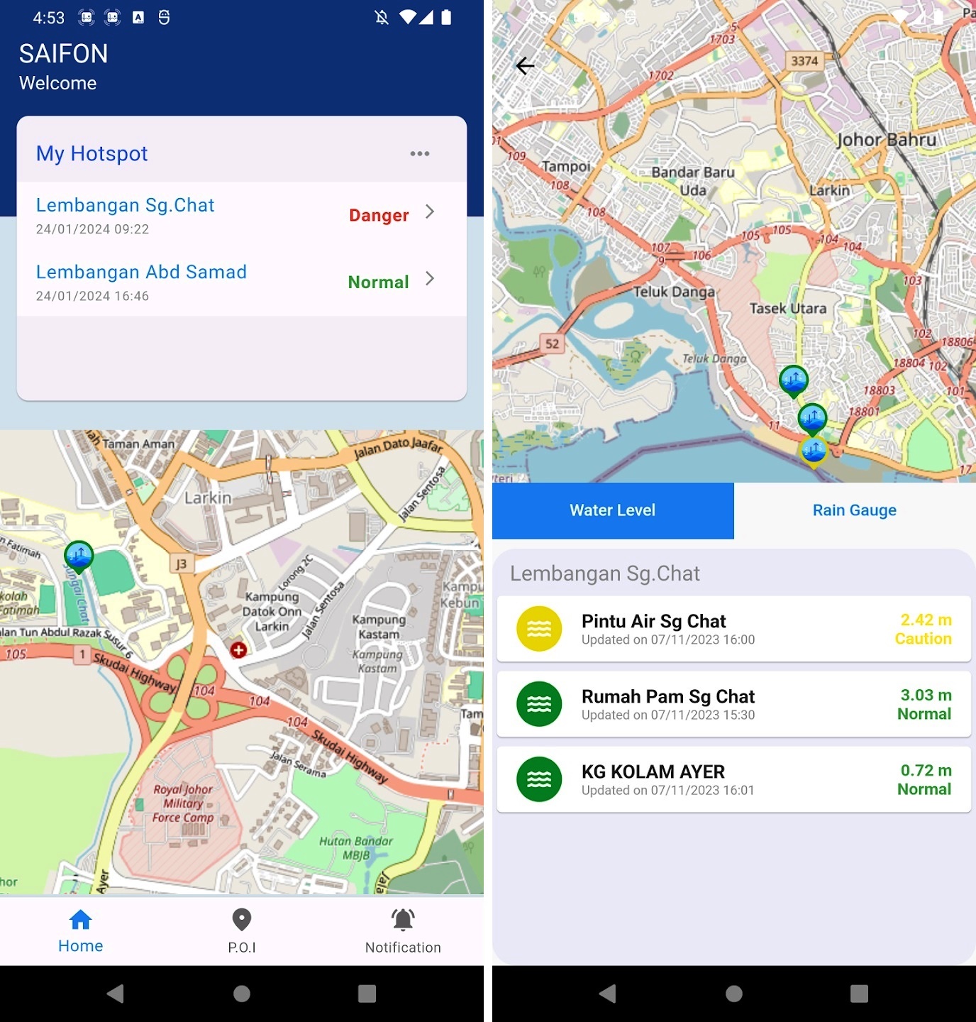 Saifon应用程式于2023 年开发,目前监测两个河流流域,即 Sungai Chat 和 Lembangan Abdul Samad,当水位上升到水患风险水平时,警报器就会启动。
