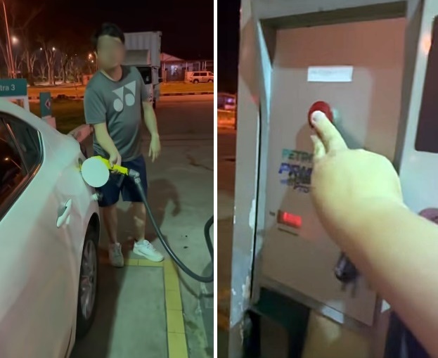 (古来2日讯)通告就近在咫尺,新加坡车司机依旧添购RON95汽油,一名男子见状,上前按下紧急按钮阻止对方继续添加,更斥责对方“不要假假!不要自己做法律!”