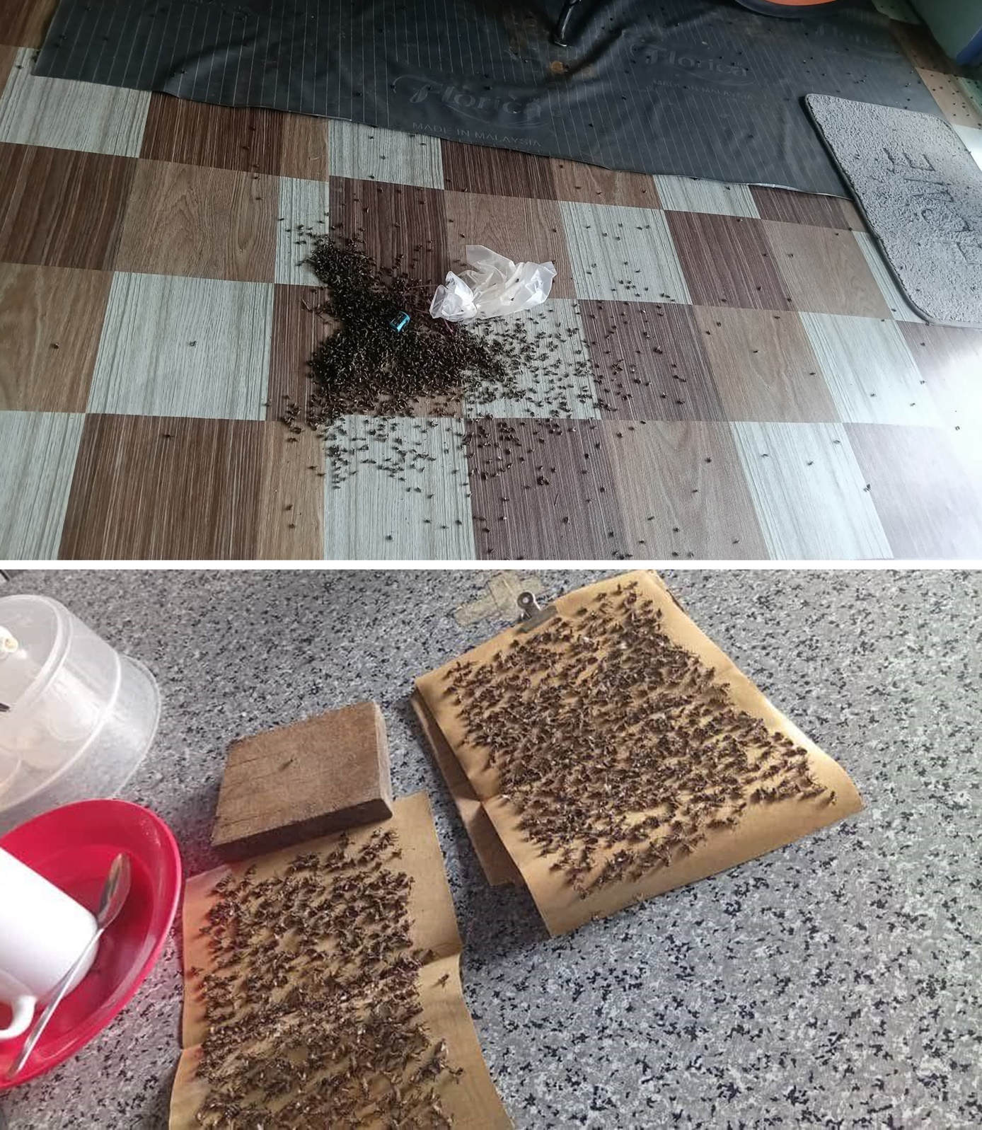 从居民的视频、图片可见,苍蝇问题已经非常严重,不仅扫出一推苍蝇尸体,粘纸上也可粘满许多苍蝇。