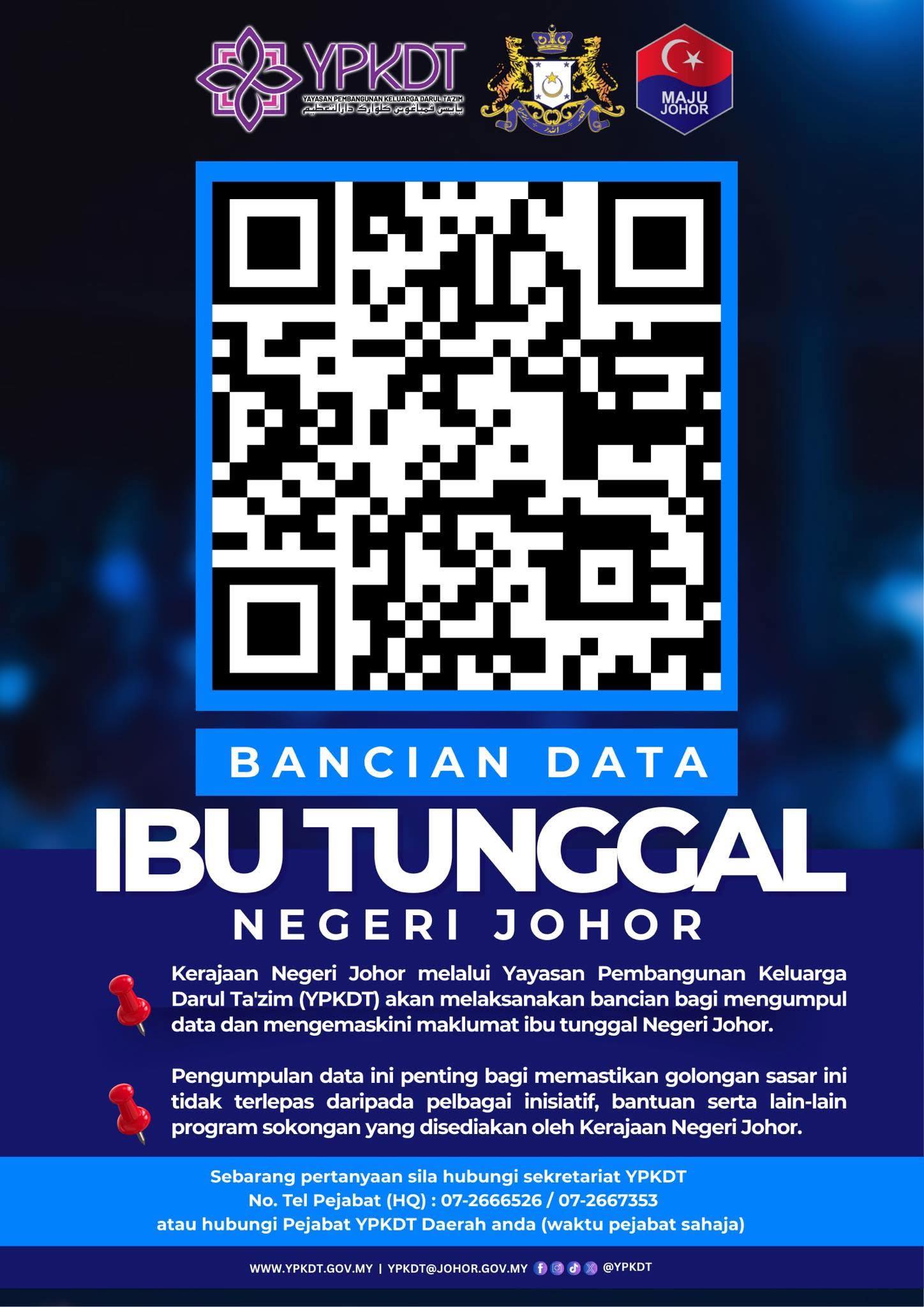 继癌症病患后,柔佛政府此次通过柔佛家庭发展基金会(YPKDT),今日起开放接受柔佛单亲妈妈数据普查登记。唯通告没有说明截止日期。