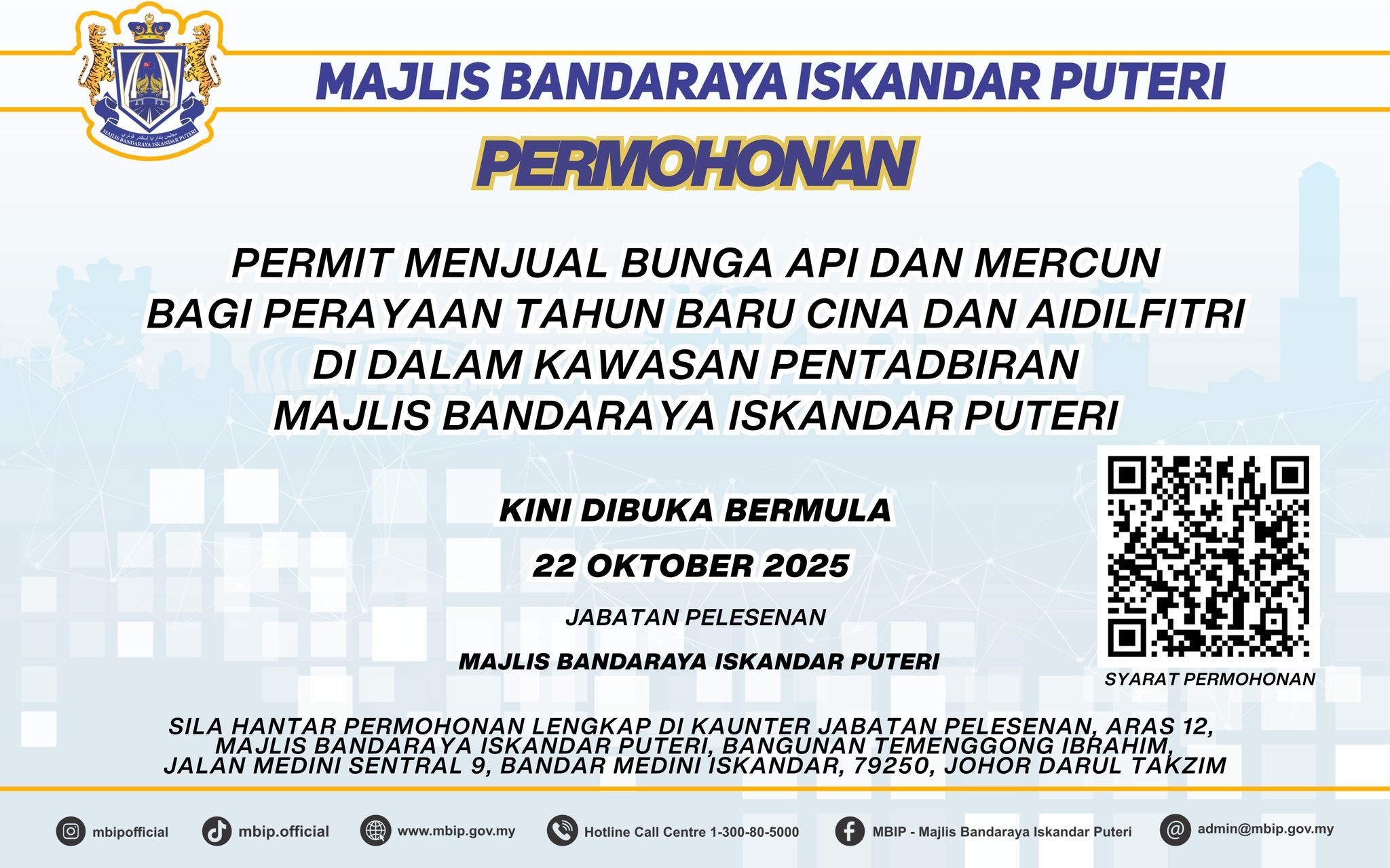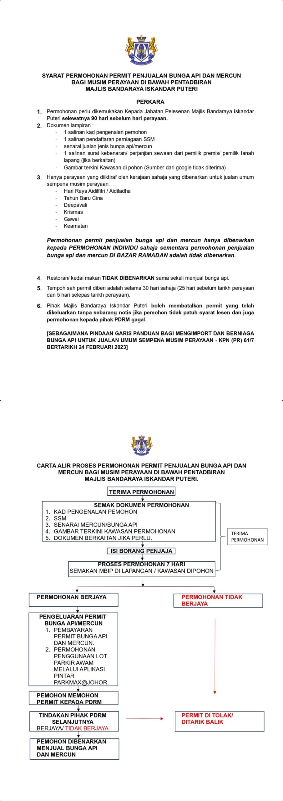 依斯干达公主城市政(MBIP)发出通告,欲在华人农历新年、开斋节售卖烟花爆竹,10月22日起开放让辖区商家申请。