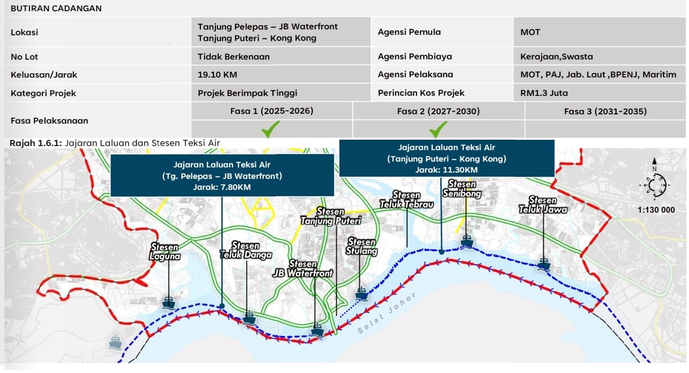 建议地点从丹绒柏勒峇斯(PTP)延伸至贡贡(Kong Kong),全长19.10公里,设有Laguna、金海湾、新山水上浮城、士都兰、地不佬湾、诗尼邦和直落爪哇站。