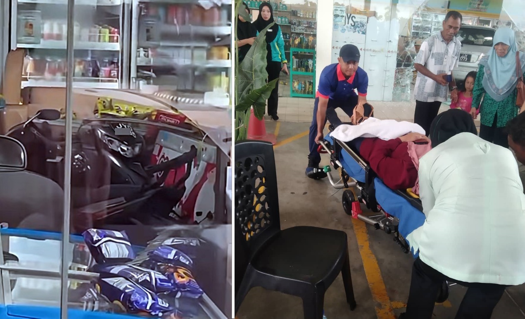 (笨珍28日讯)年逾80岁老司机疑误踩油门,油站处撞及摩哆后,再撞破玻璃冲入便利店,商品散落一地,一片狼藉。