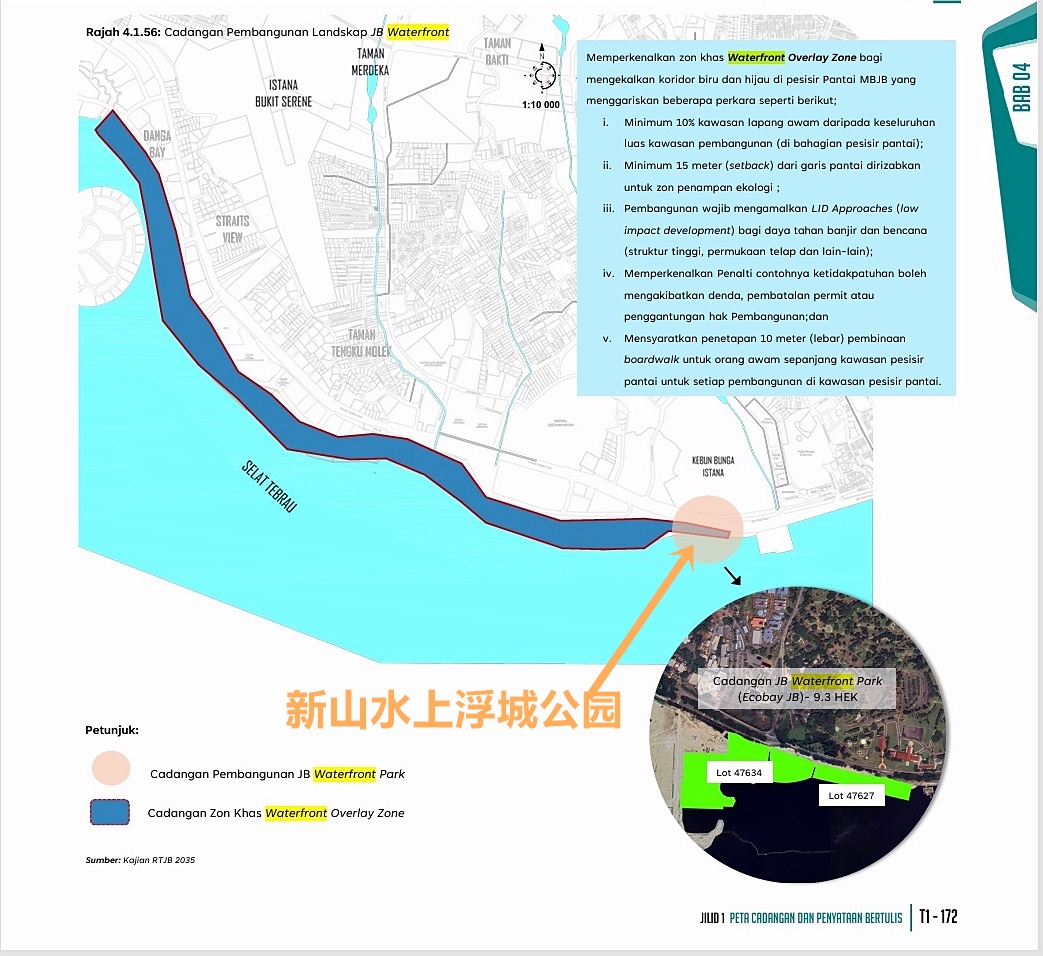 在草案中,重点提及“新山水上浮城”的发展概念,计划打造成“水上浮城覆盖区”(Waterfront Overlay Zone),以维护新山海岸线的绿色和蓝色走廊。