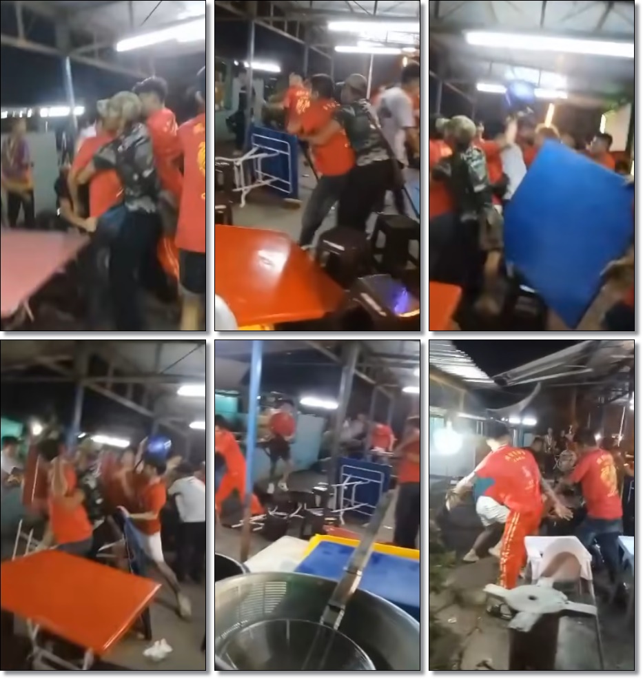 网上流传视,两批人互相叫嚣,随后一人将一辆摩哆推倒,双方便扭打起来,有的掀播桌椅,有的扔头盔,也有拳打脚踢。
