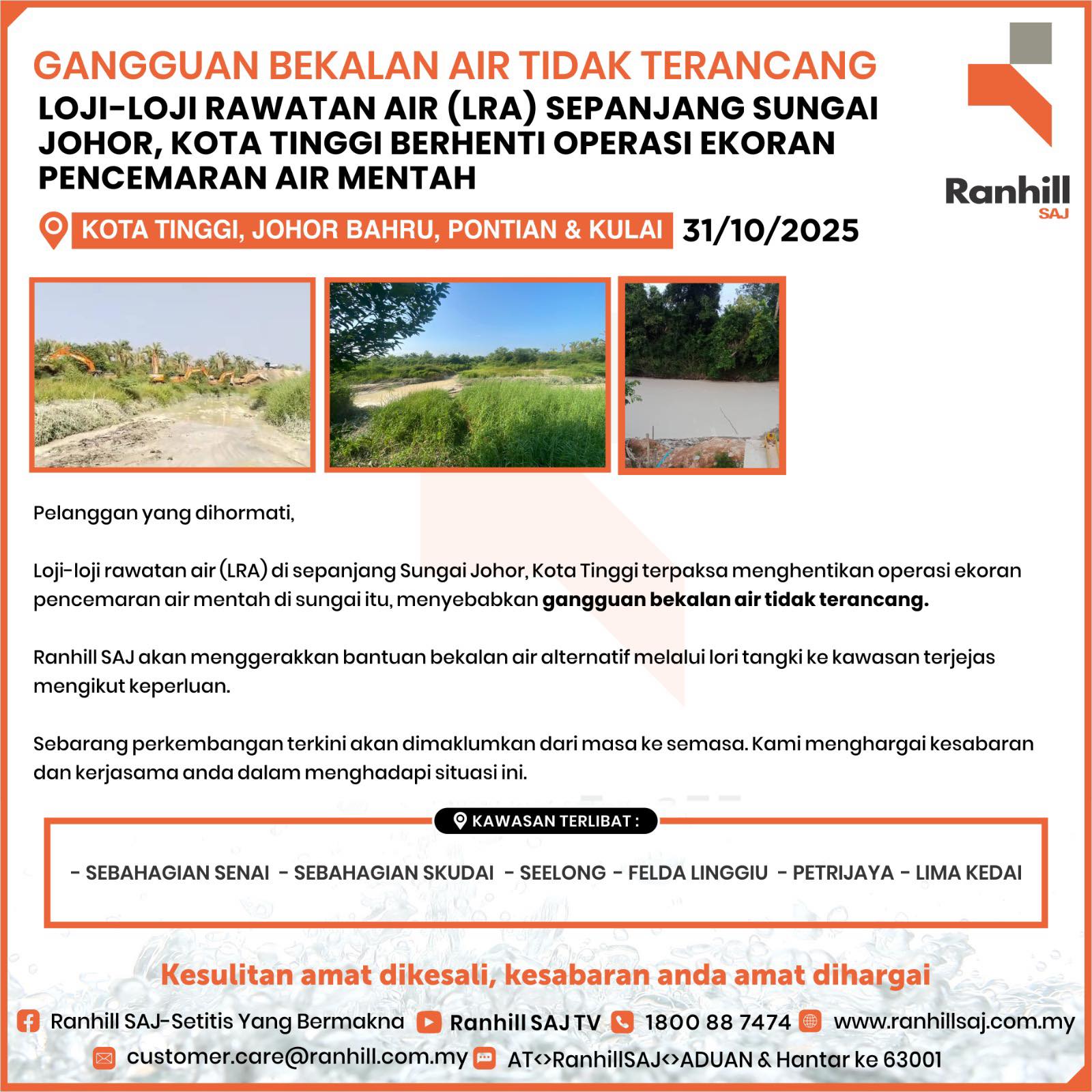 柔佛水务联熹有限公司(SAJ Ranhill)通告,由于柔佛河河水污染,哥打丁宜沿岸的滤水站(LRA)被迫暂停运作,出现突发供水中断状况。
