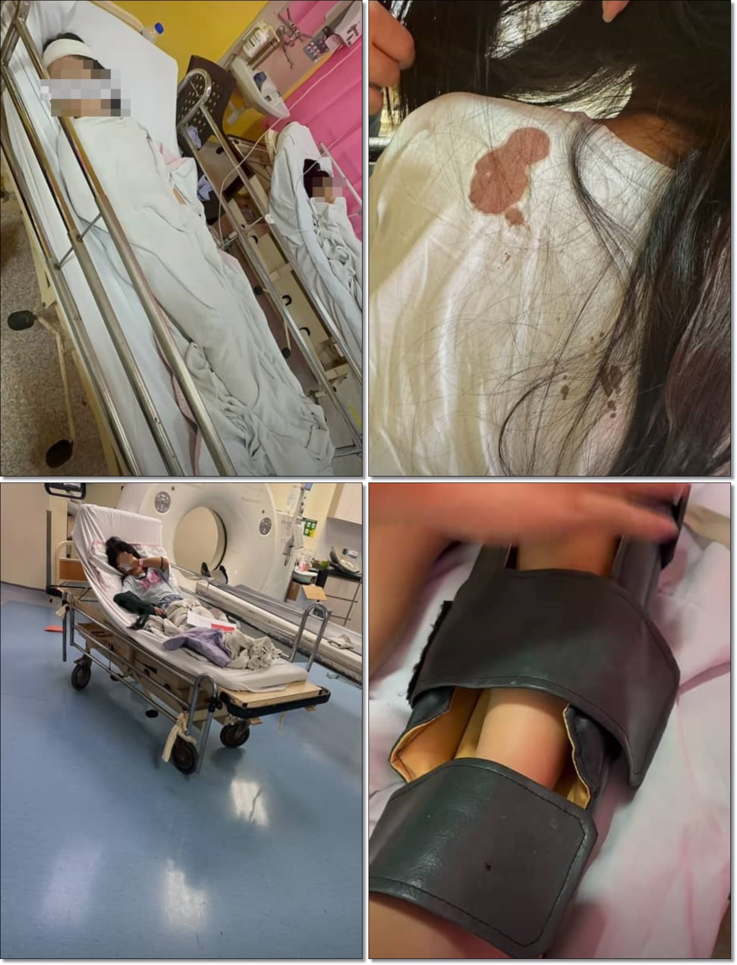 她说,大女儿头部受伤缝针,小女儿的CT报告显示骨盆有骨裂情况,不能乱动,而且感觉疼痛。两人的手和脚也骨折。