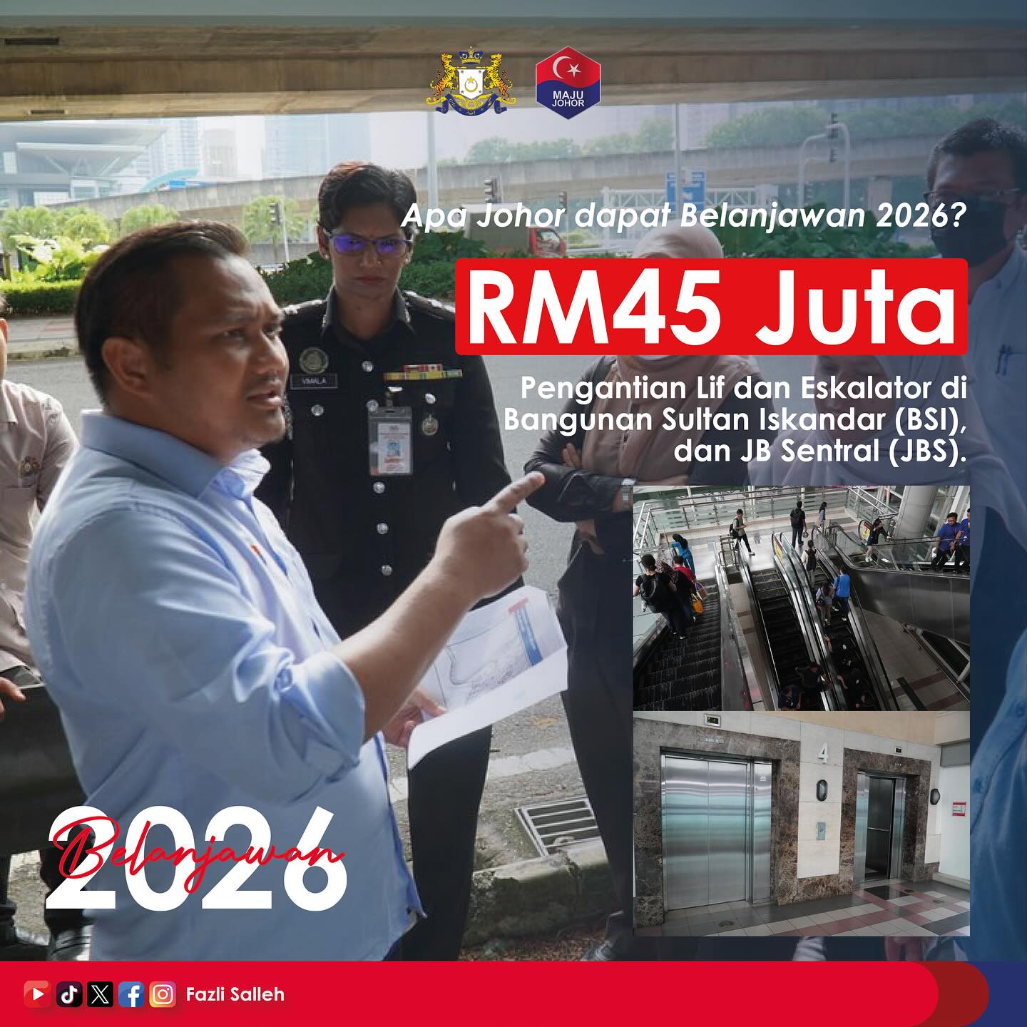 他说,在2026年财政预算案中,首相已批准拨款4500万令吉,用于更换JB Sentral 所有现有的电梯和自动扶梯。