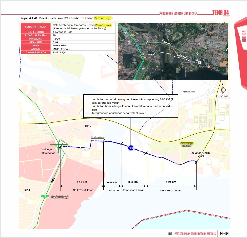 根据草案计划,这座建议中的百万镇大桥全长3.4公里,衔接Sri Stulang桥和Senibong大道,共有往来4条车道。