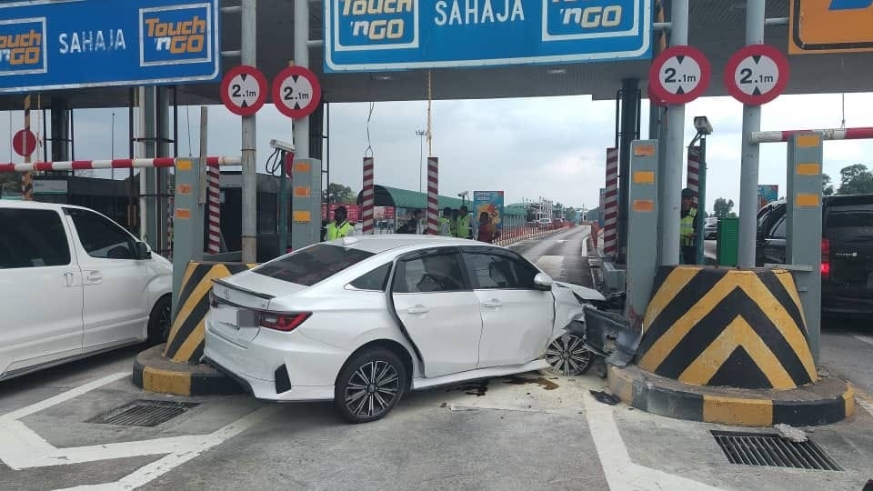 (古来9日讯)2名女子和1名婴孩共乘的轿车,失控撞向士姑来收费站,造成女乘客受伤,女司机和婴孩饱受惊吓。