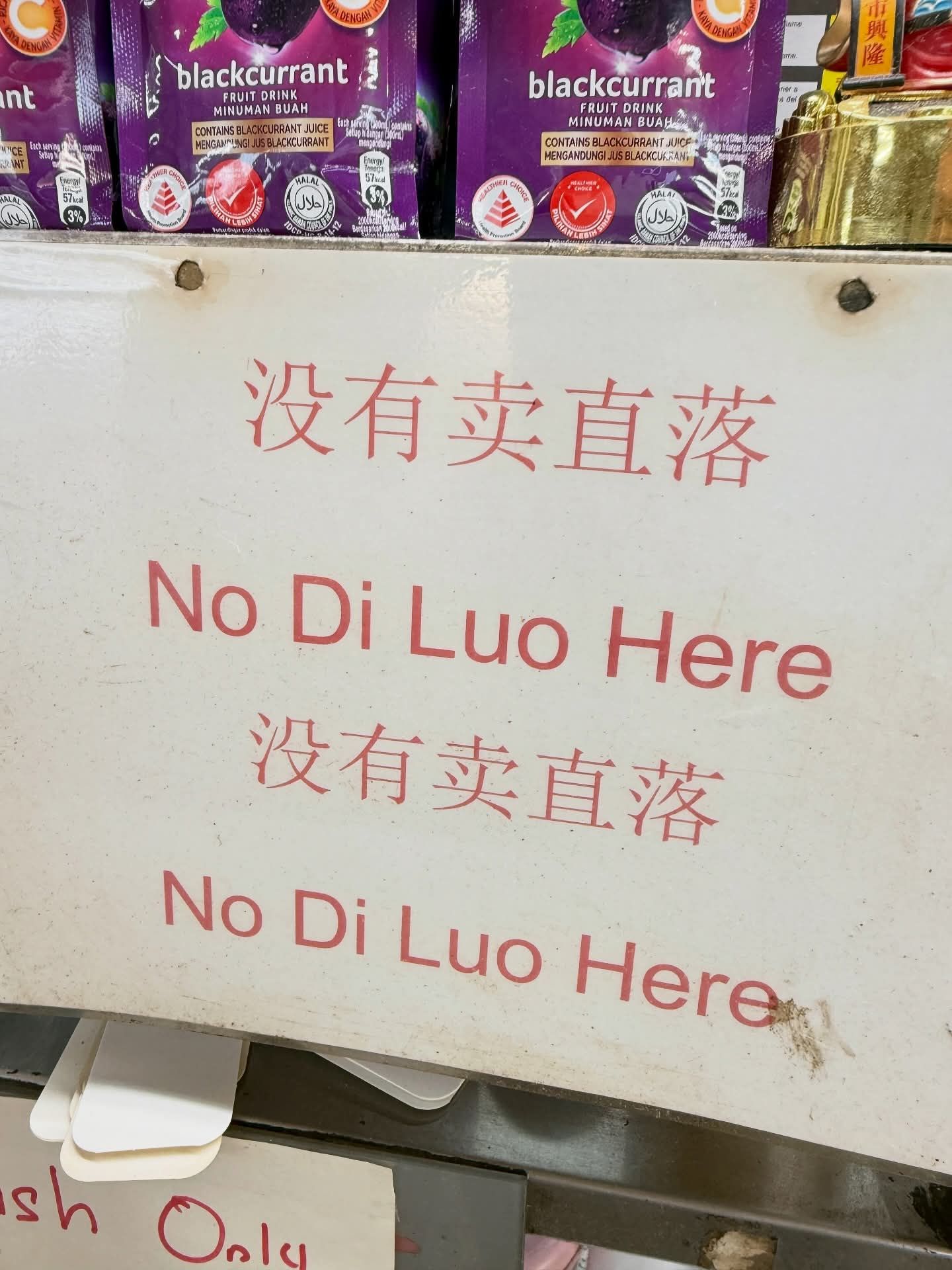 有网民Alam Cheng今日分享,一间店张挂的告示:“没有卖直落。”(No Di Luo here)。