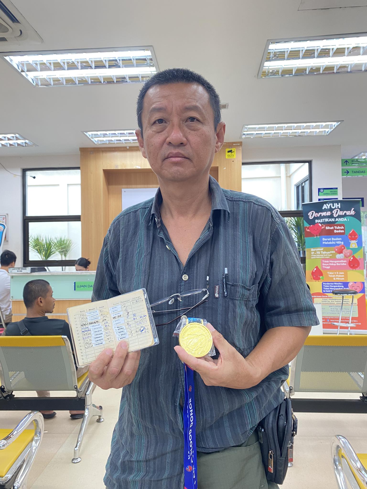 59岁的陈丁山(Tan Teng Sun)因为献血多达71次,日前(11月13日)获得新山中央医院颁发金牌。这也是院方颁发的第70枚金牌。