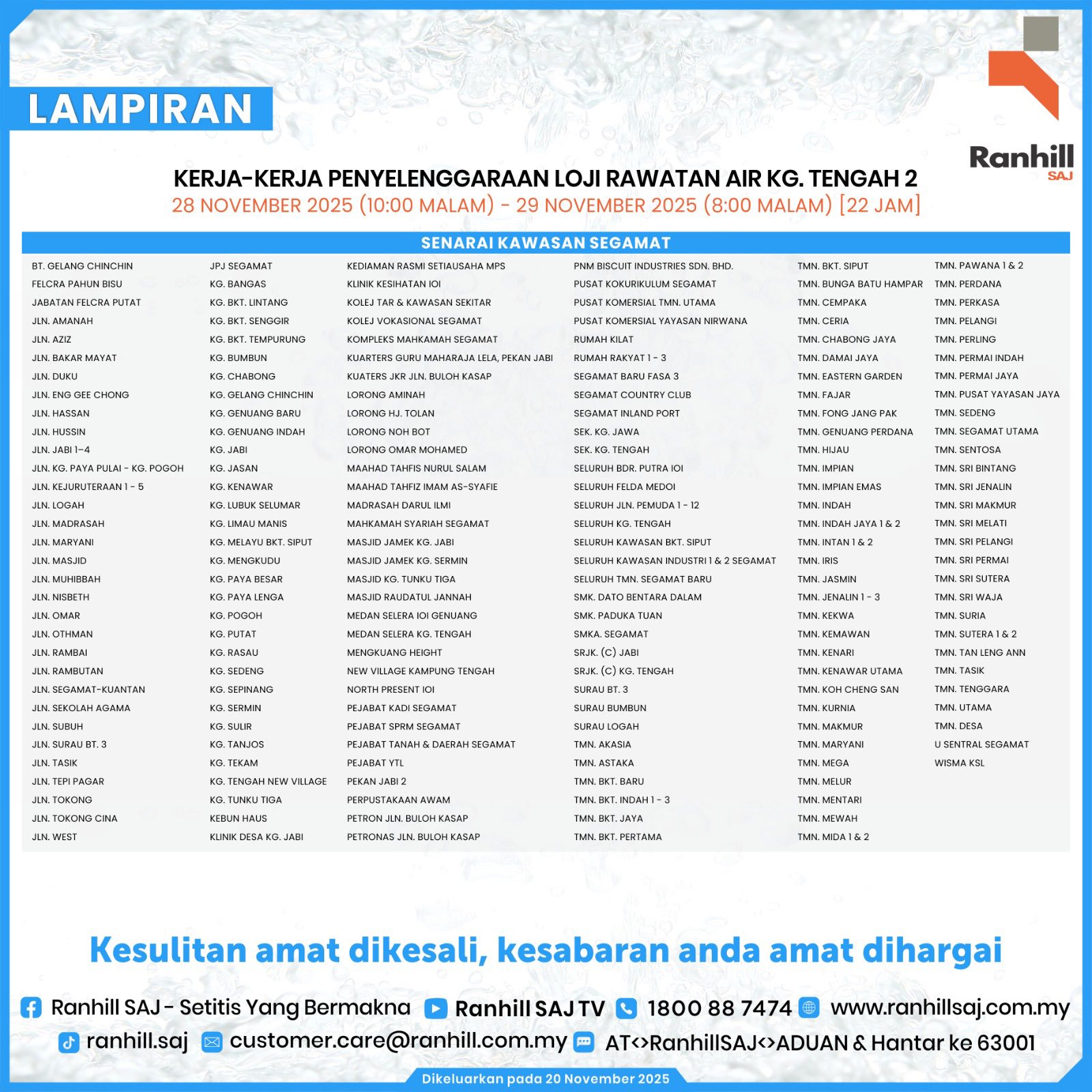 登雅甘榜2滤水站(Loji Rawatan Air Kg Tengah2)例常维修, 11月28日晚上10时,直到11月29日晚上8时,历时22小时,北根也美、登雅新村、太子城、武吉仕砵等地水供受影响。