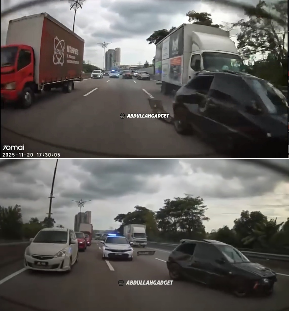 视频可见,被追捕的黑色轿车已撞得“伤痕累累”,最后撞向左侧护栏,车头还冒烟。
