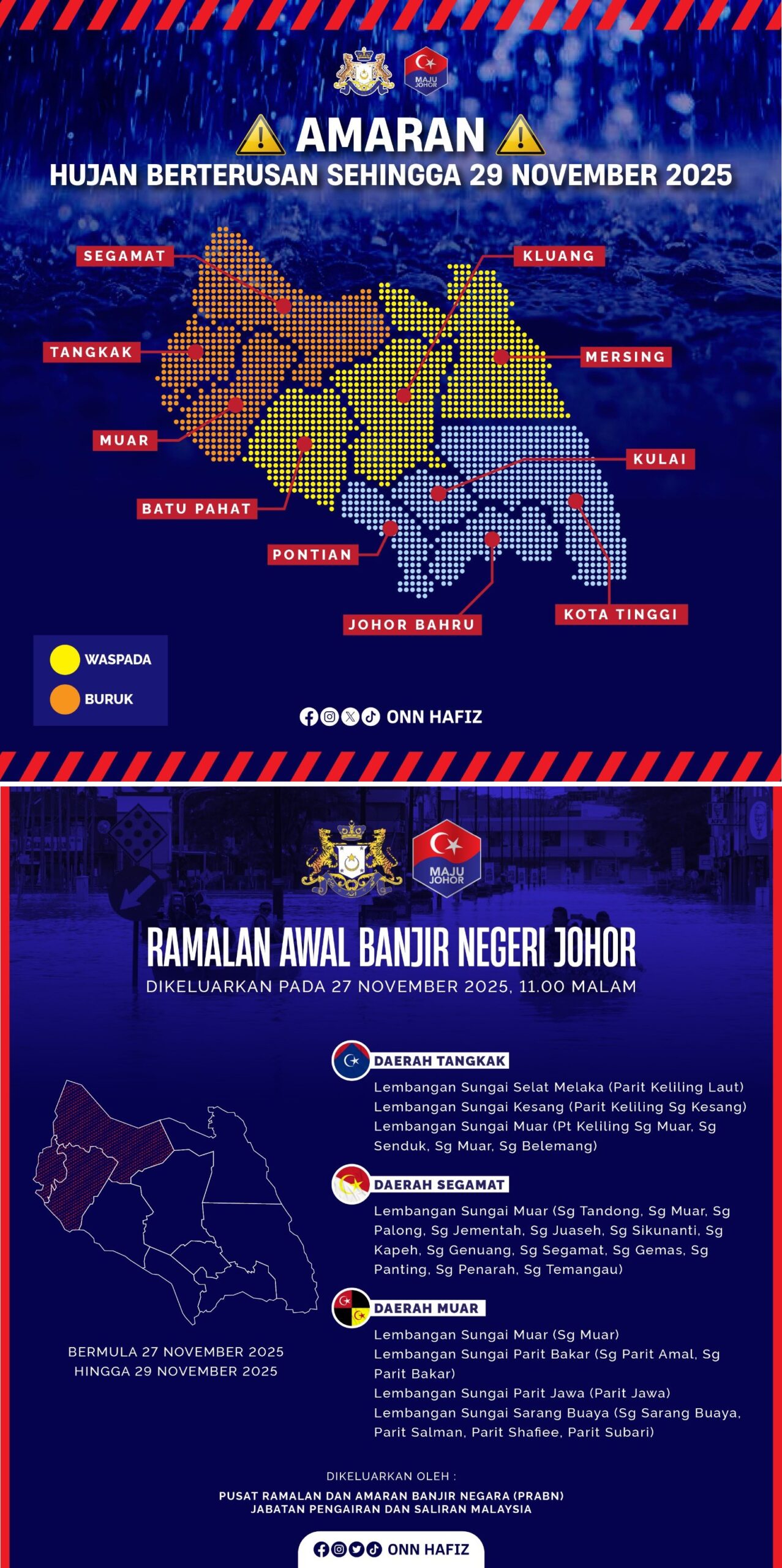 柔佛州务大臣拿督翁哈菲兹发文指出,根据国家水灾预测及警报中心(PRABN)和气象局的最新报告,柔佛的昔加末、东甲和麻坡的多个地区仍面临水灾风险。