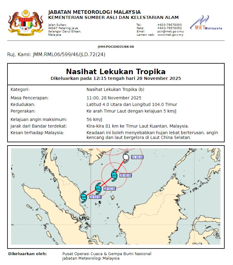 截至上午11时,热带低压(b)位于北纬4.0°、东经104.0°,预计以每小时5公里速度向东北方向移动,最大持续风速可达每小时56公里。