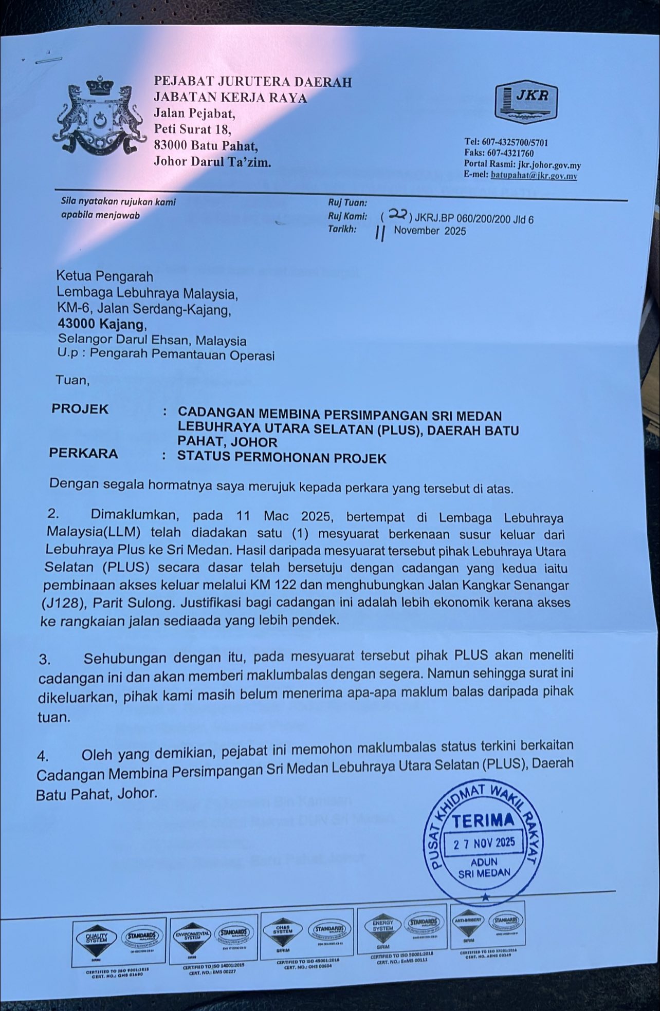 他说,会议中,南北大道公司已原则上同意研究其中一项方案,即在 KM122 建立新的交流道(出入口),并连接 巴力士隆(Parit Sulong)的Kangkar Senangar(J128)路,以其被评估为更符合经济与交通规划需求。