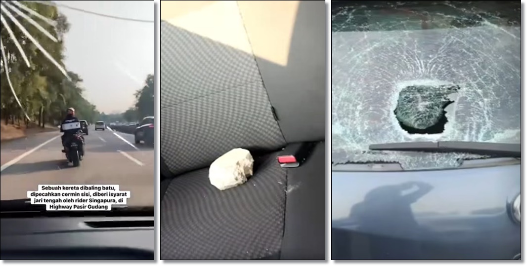 (新山2日讯)轿车司机朝突然换车道的摩哆鸣笛后,便遭到石头砸破挡风玻璃,疑是骑士所为,愤而报警。