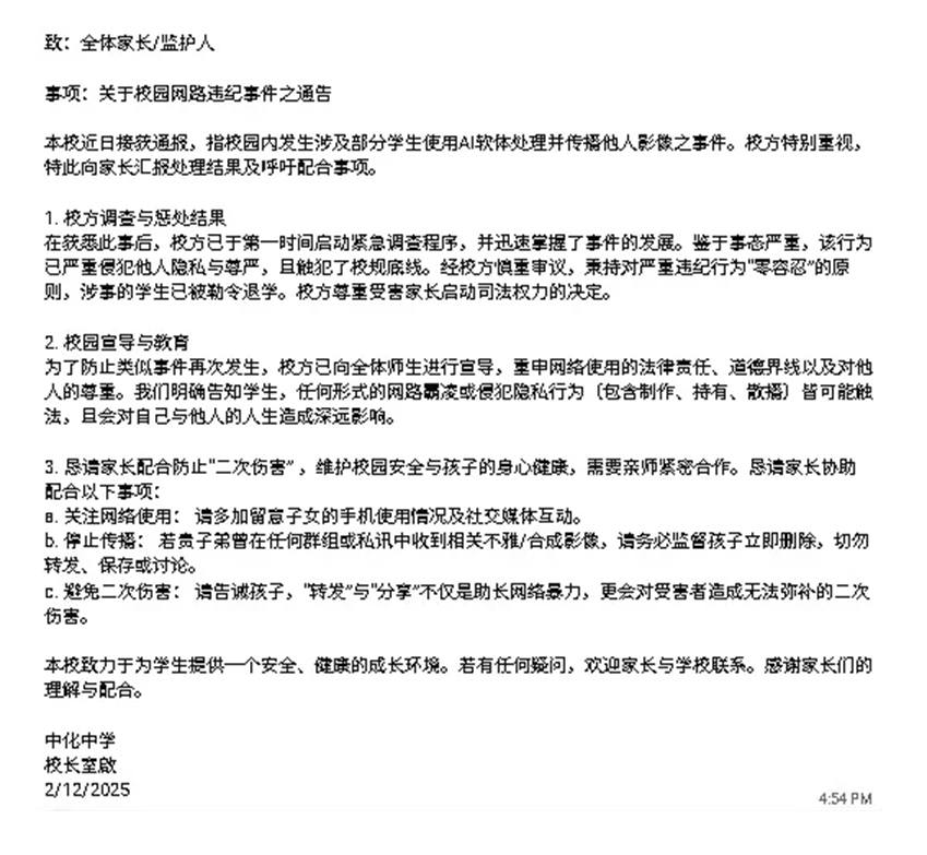 校长室通告指出,该校近日接通报,指校园内发生涉及部分学生使用AI软体处理并传播他人影做之事件。