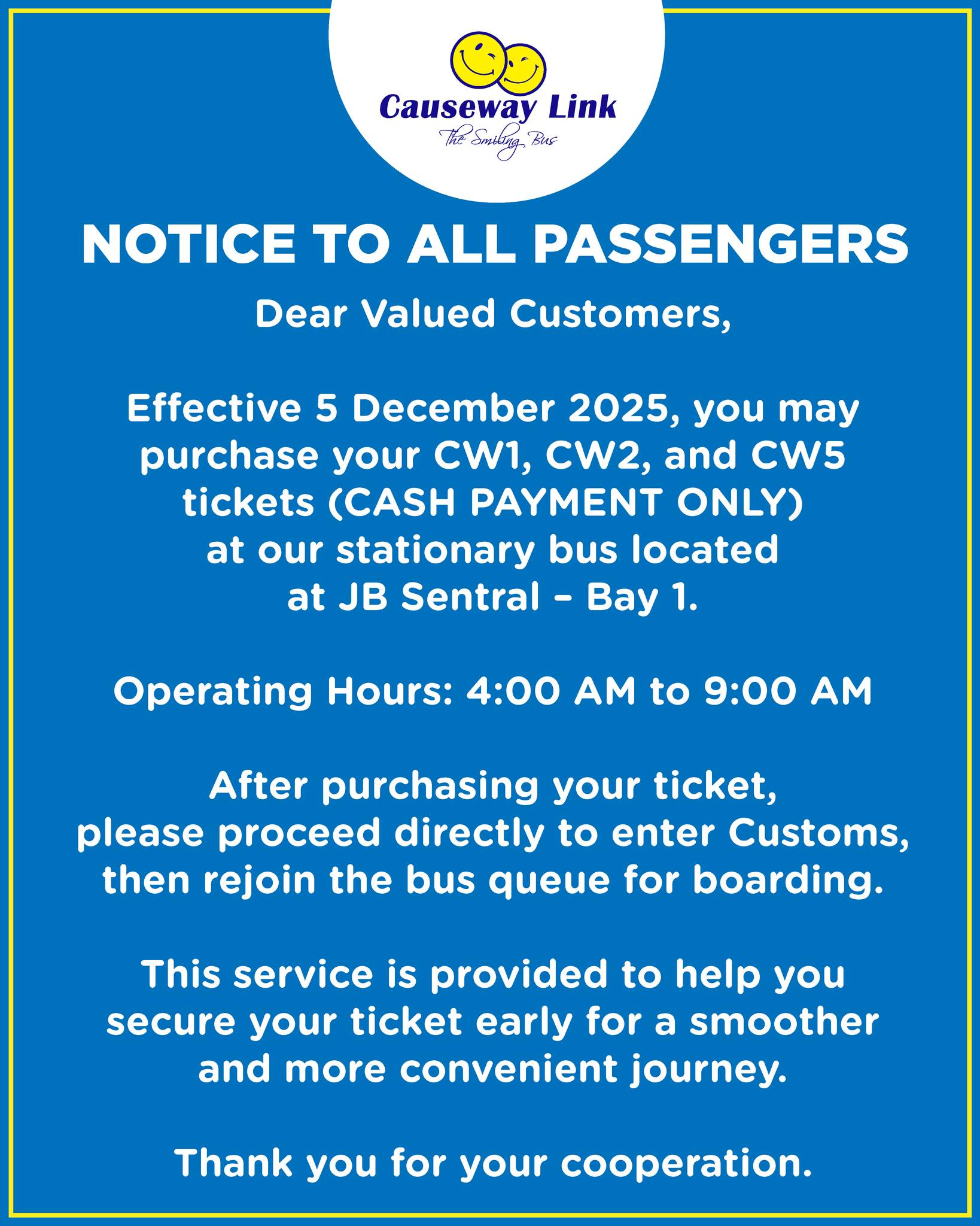 Causeway Link巴士发布通告,这只限使用现金购买巴士车票的乘客,而且时间是清晨4时至早上9时高峰时段。