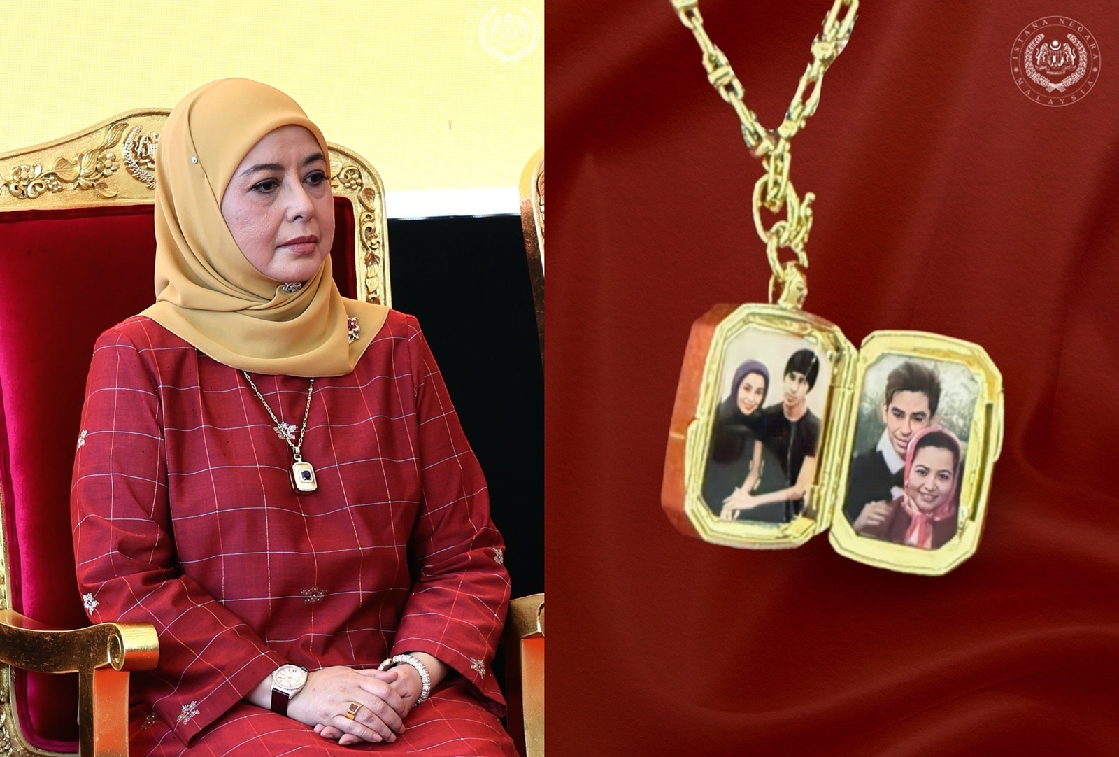 元首后拉惹查丽苏菲雅不仅戴着三王子生前的戒子,身上佩戴的项链,嵌入着元首后与三王子的两张合照,这是国家元首赠送的元首后的礼物。