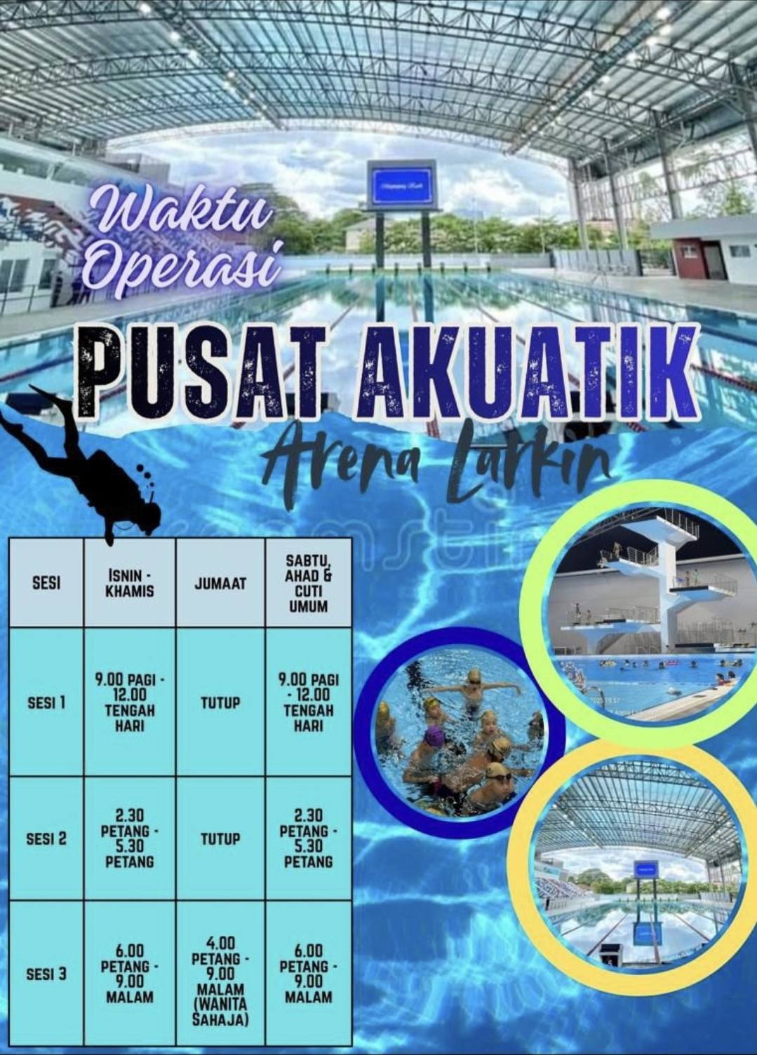 (新山8日讯)拉庆水上竞技中心(Pusat Akuatik Arena)于星期五闭馆,但午后至晚上间开放给女性民众入内游泳。
