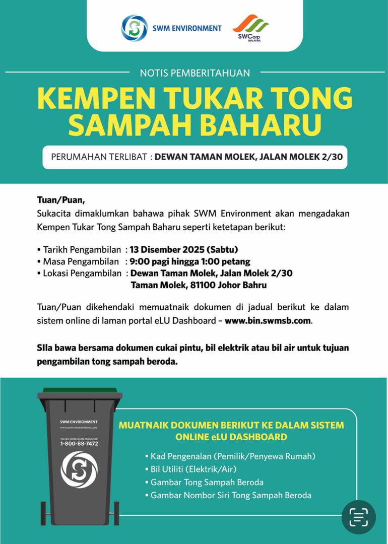 📌 地点:Dewan Taman Molek, Jalan Molek 2/30, Taman Molek, 81100 JB.