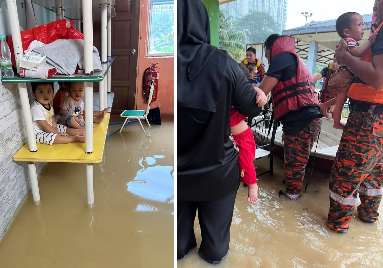 (新山12日讯)幼儿院淹水,近30名孩童婴儿困在水中,等候消拯叔叔前去救援。