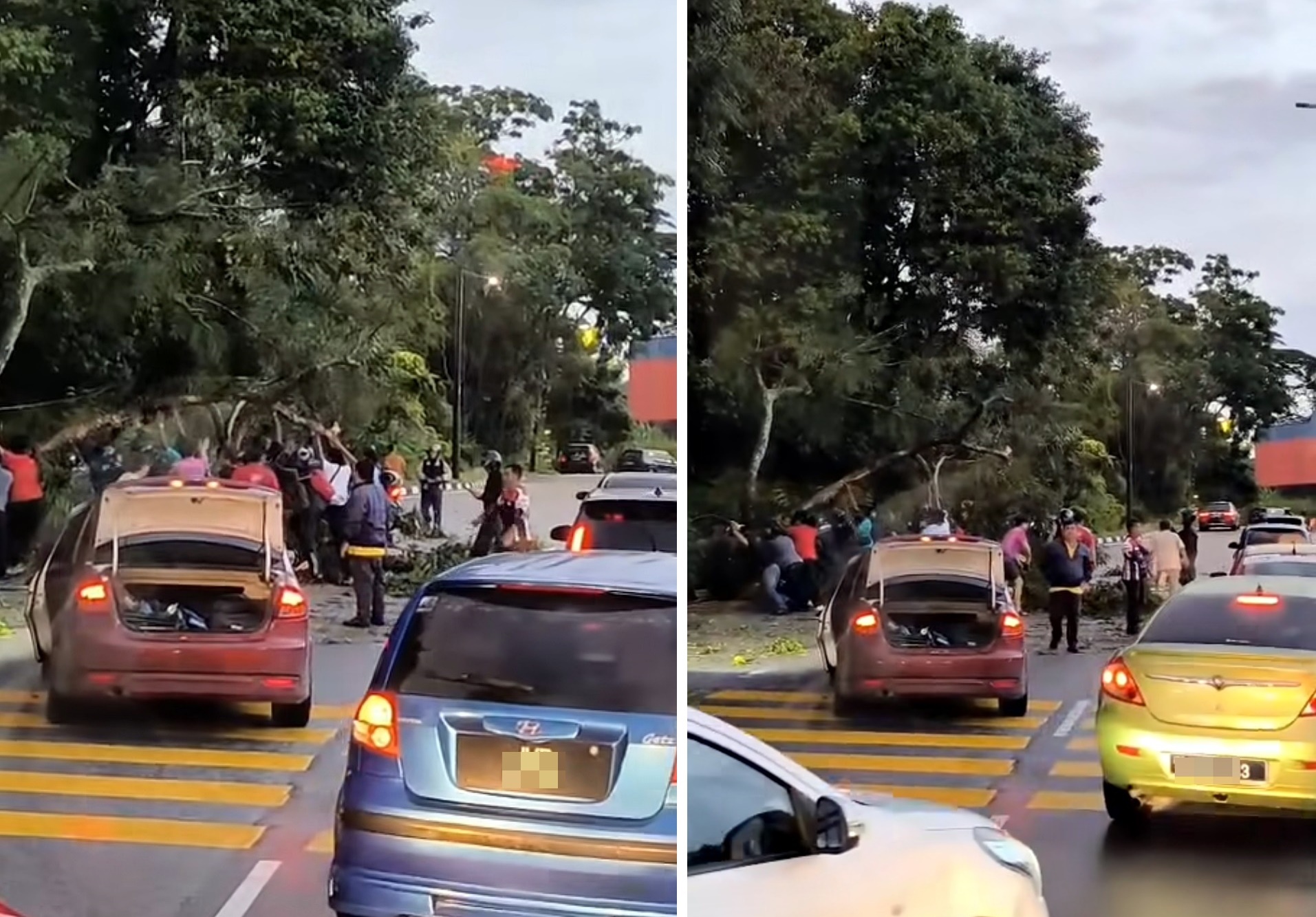 (新山15日讯)风雨无情人有情!暴风雨造成树倒,险些砸中轿车更阻挡交通,逾15名民众齐心合力,将大树推到一旁,体现大马团结精神。