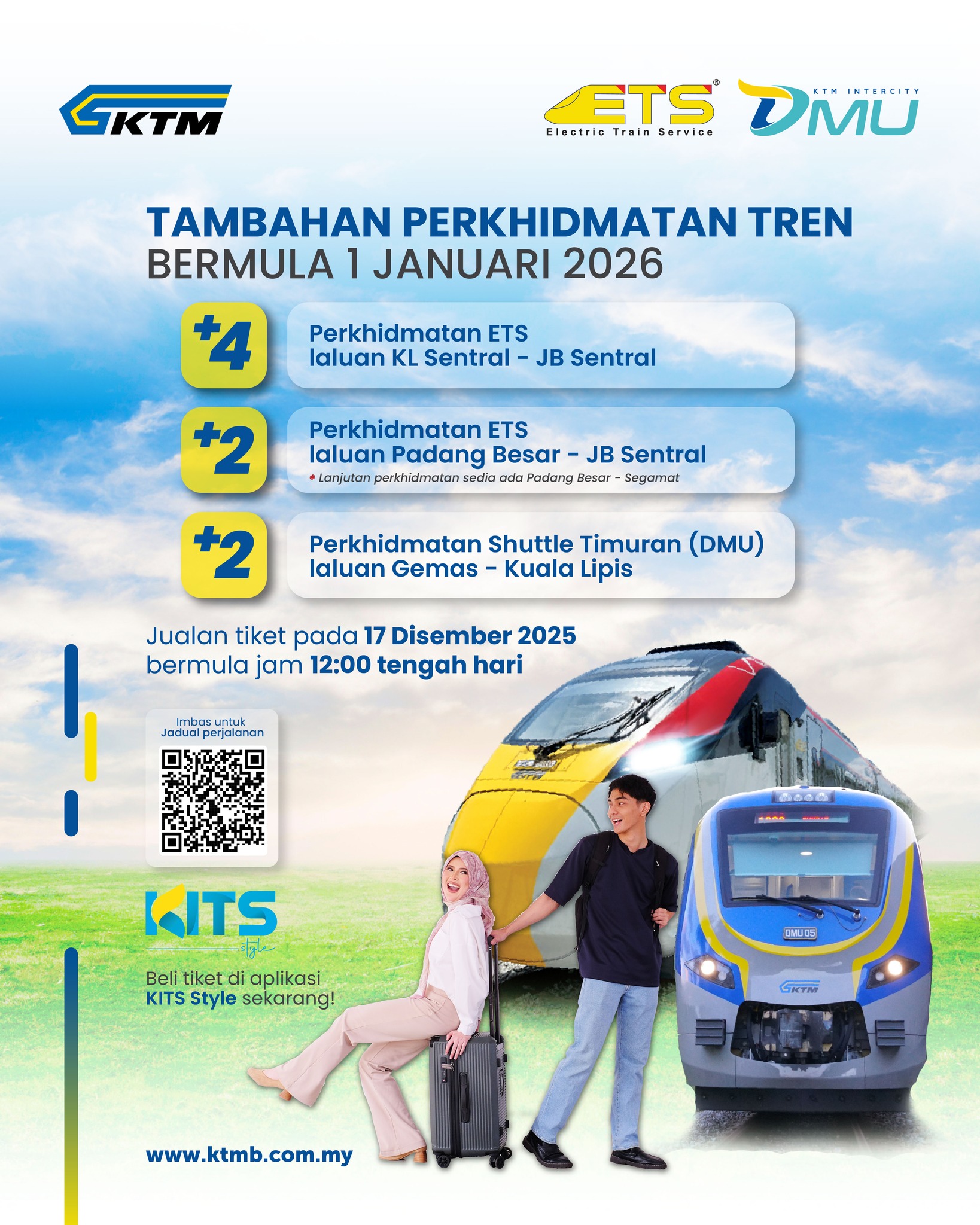 民众可通过 KITS Style 应用程式、上网 https://bit.ly/47J3W1w 或所有 KTMB售票渠道购买车票。