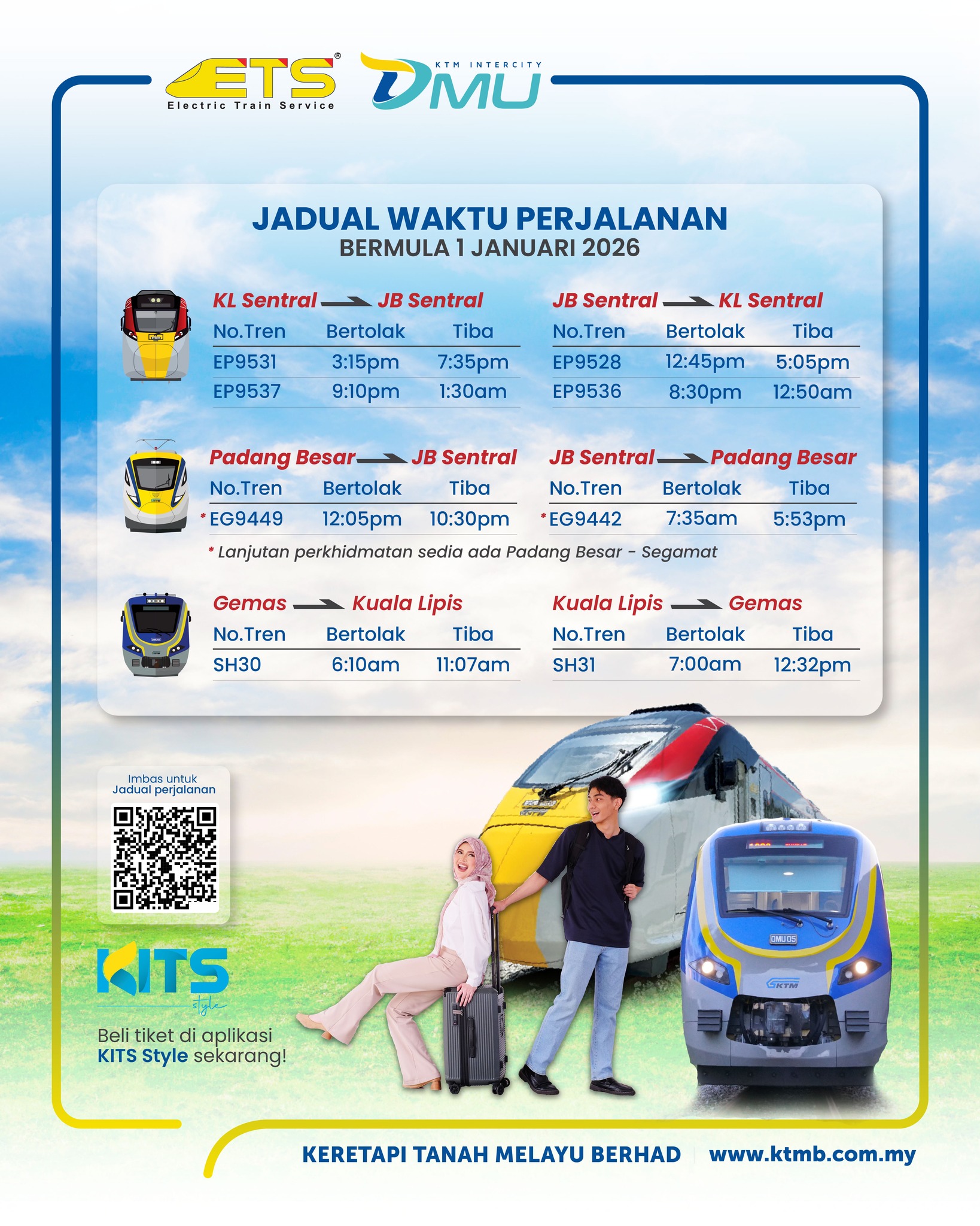 (新山16日讯)明年1月1日起,新山往返吉隆坡双轨电动火车(ETS)增加4班次,使到每天共有8趟班次。同时,新山往返北马的巴东勿刹班次开通,每天往返有2趟班次。