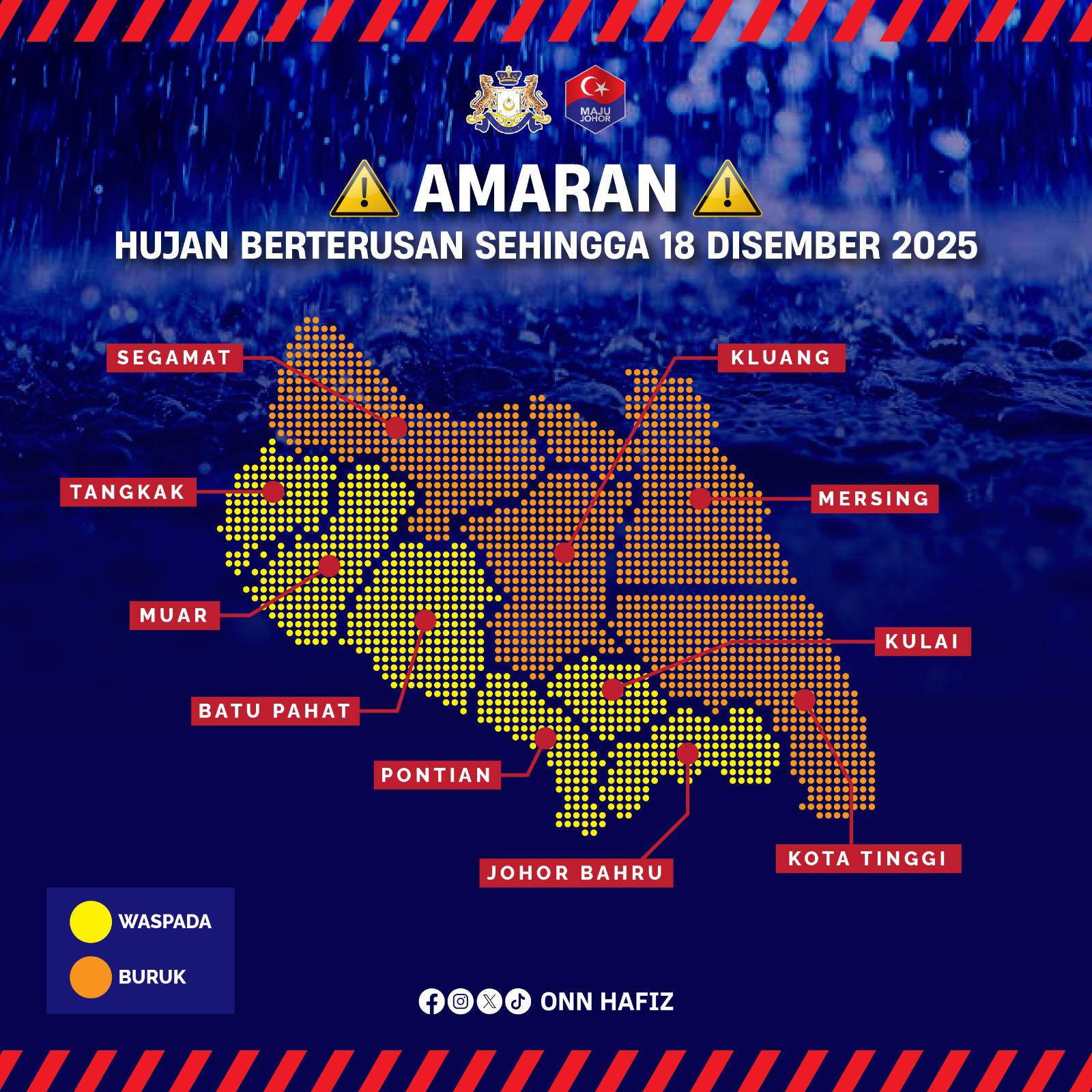 柔佛州务大臣拿督翁哈菲兹今日发文指出,根据大马气象局(MET Malaysia)的最新信息,柔佛目前处于持续降雨警告状态,该警告分为两个级别,即恶劣级别(橙色)、警戒级别(黄色)。