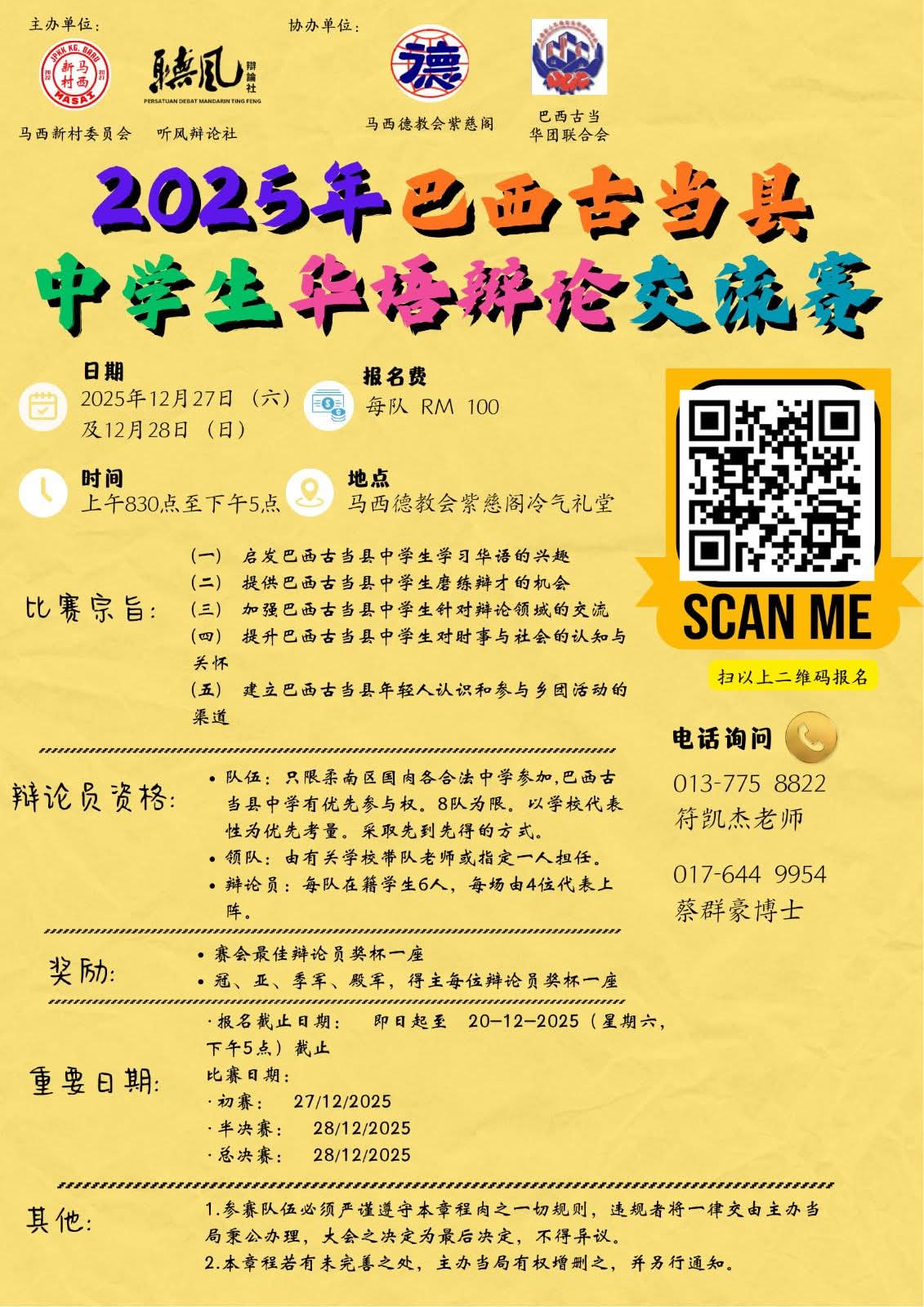 这场华语辩论交流赛于2025年12月27日(星期六)及 28日(星期日)举行,时间是早上8时30分至下午5时,地点位于马西德教会紫慈阁冷气礼堂。