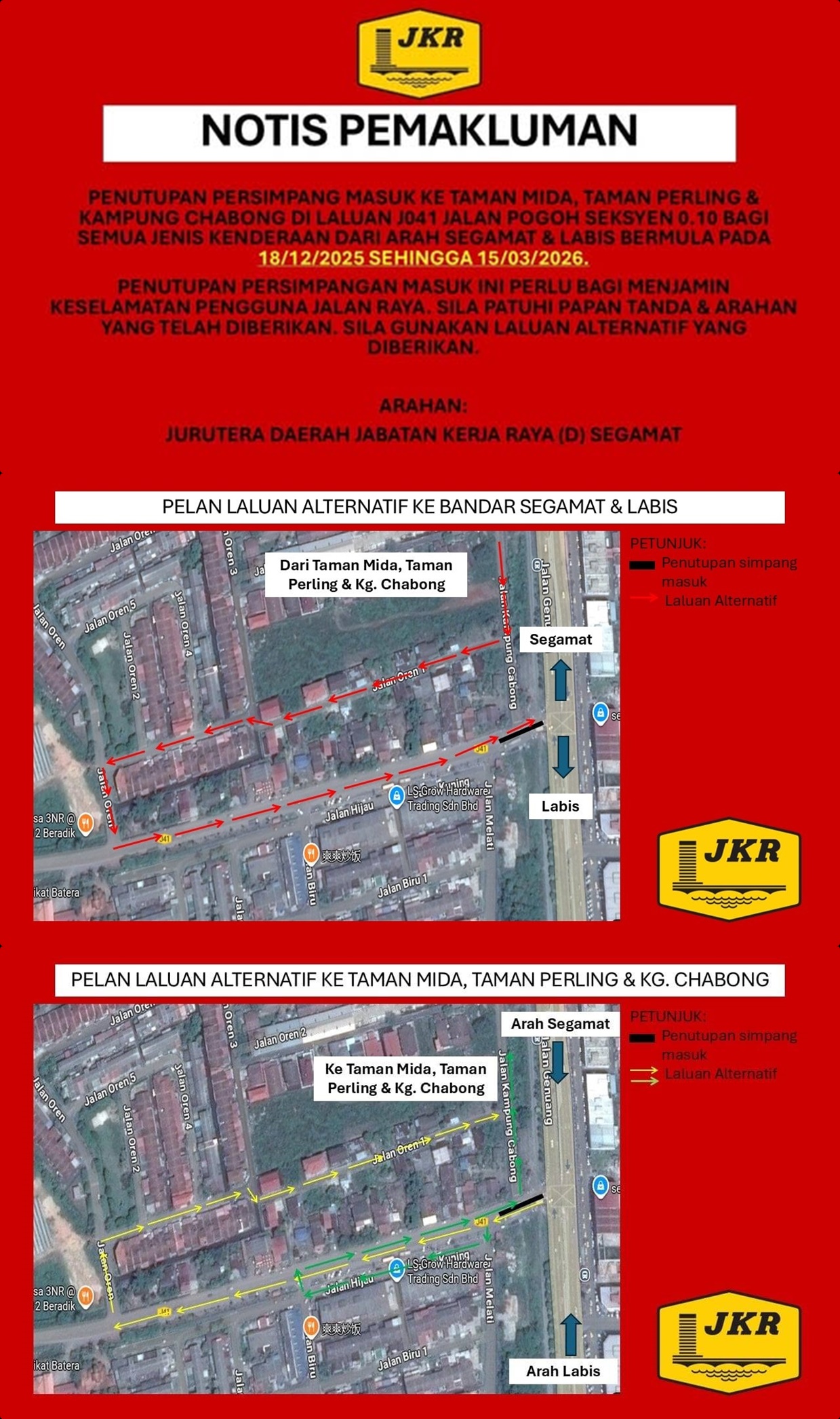 昔加末公共工程局和承包商于12月16日发出通告,从今年12月18日至明年3月15日,巴莪路(J041, Jalan Pogoh Seksyen 0.10)路口封路。