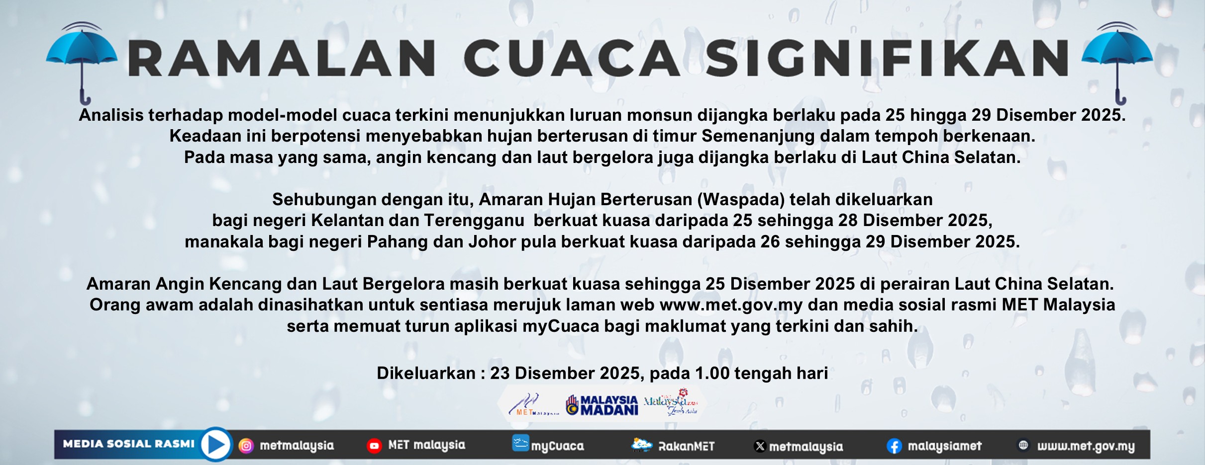 马来西亚气象局(MET Malaysia)向柔佛人民发布持续降雨警告(Waspada),受影响地区有昔加末、居銮、丰盛港和哥打丁宜县。